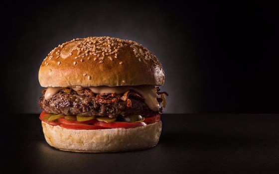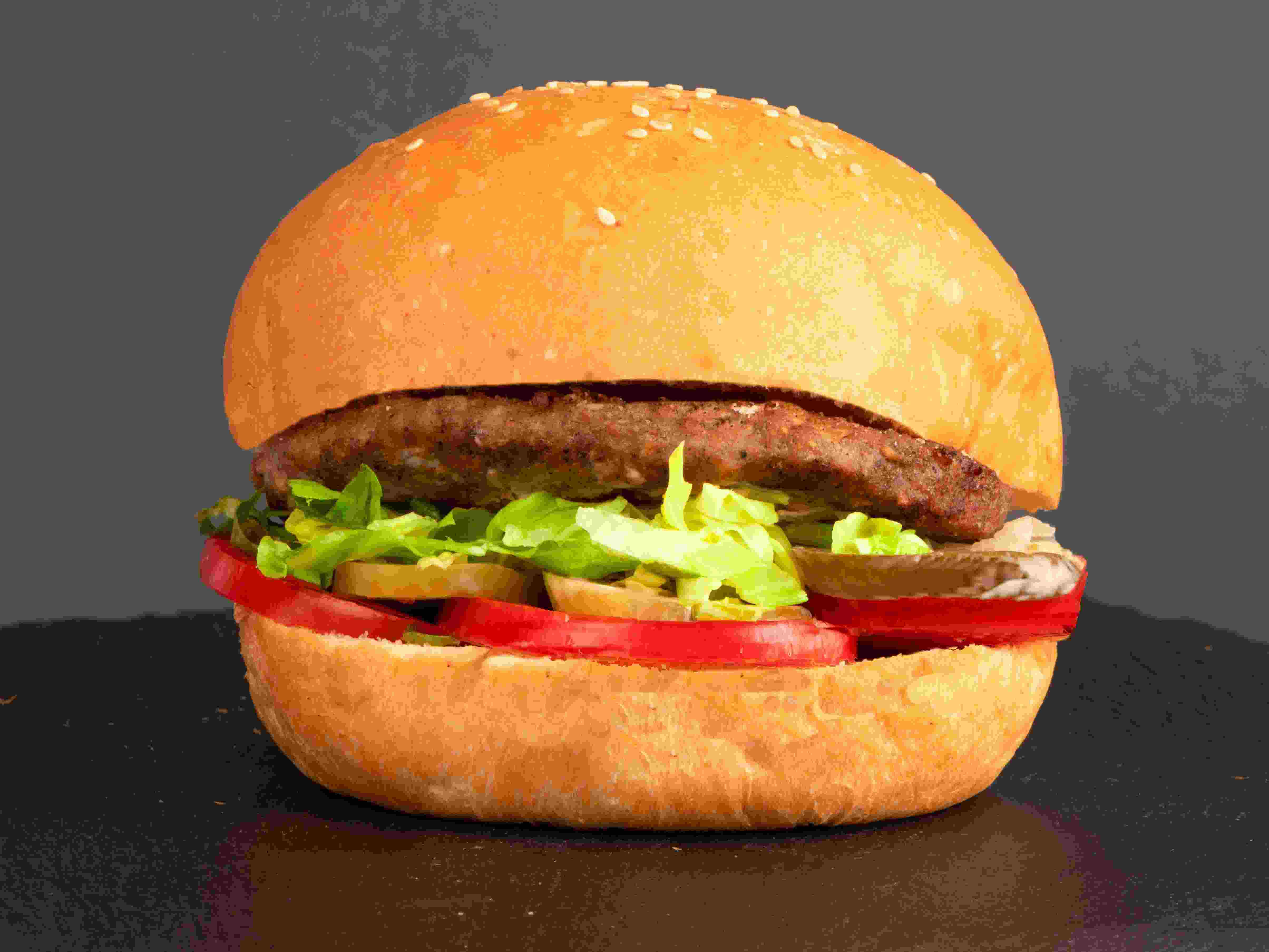 یک عدد برگر دست ساز گوشت مخلوط گوساله و گوسفندی ۱۰۰ گرمی، کاهو، گوجه، خیارشور، سس مخصوص، نان گرد