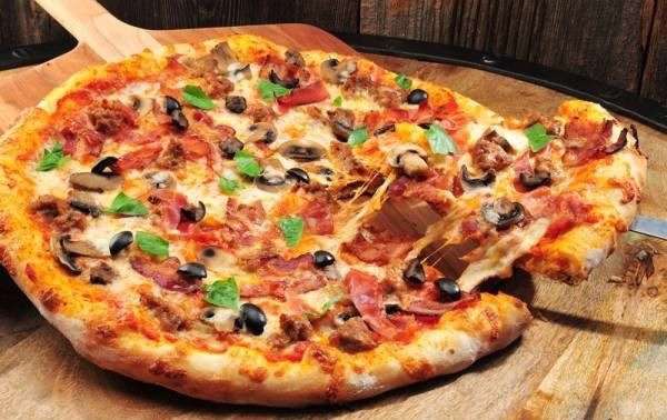 خمیر پیتزا آمریکایی، گوشت مخلوط گوساله و گوسفندی چرخ کرده، قارچ، پنیر پیتزا، زیتون، فلفل دلمه ای، ذرت، ۳ عدد سس کچاپ